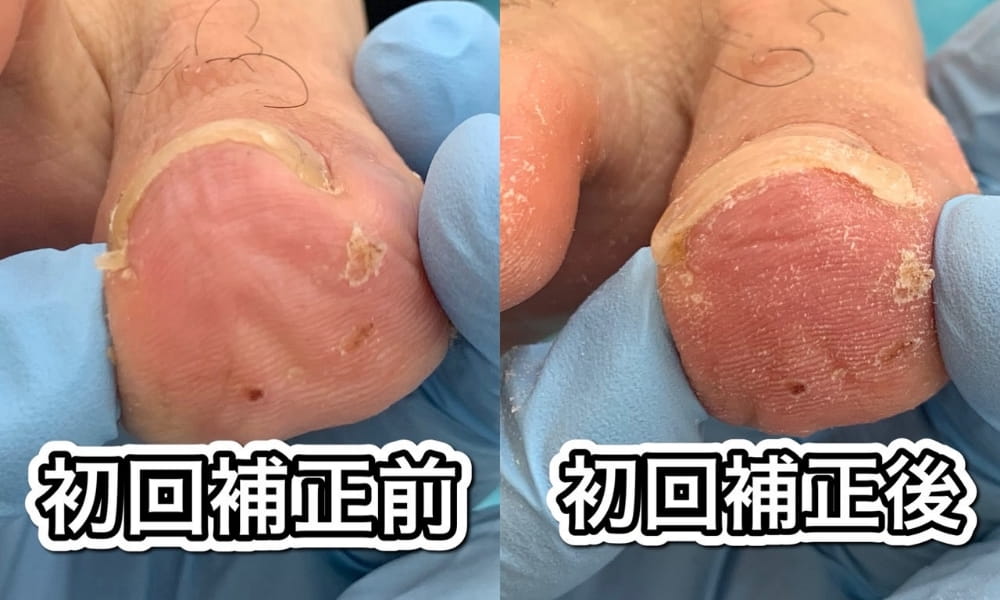 今回は感染症状よりも、巻き爪による皮膚への圧迫刺激が主な痛みの原因と判断し、巻き爪補正を行いました。補正後は巻き爪の角度が約80度から50度まで改善し施術直後から痛みは無くなりました。